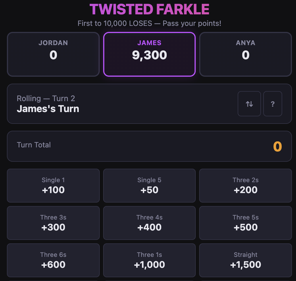 A score-tracking app for Twisted Farkle — the reversed variant where the first player to 10,000 loses. Pass your points and pray.